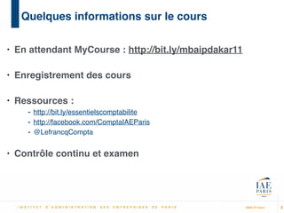 Le document présente le programme de gestion comptable de la promotion 11 du MBA international à Dakar, dirigé par Stéphane Lefrancq. Il couvre les fondements de la comptabilité, les activités ordinaires, les actifs non courants et courants, le financement, ainsi que les dépréciations et provisions. Des ressources en ligne et un plan de cours détaillé accompagnent les thèmes abordés.