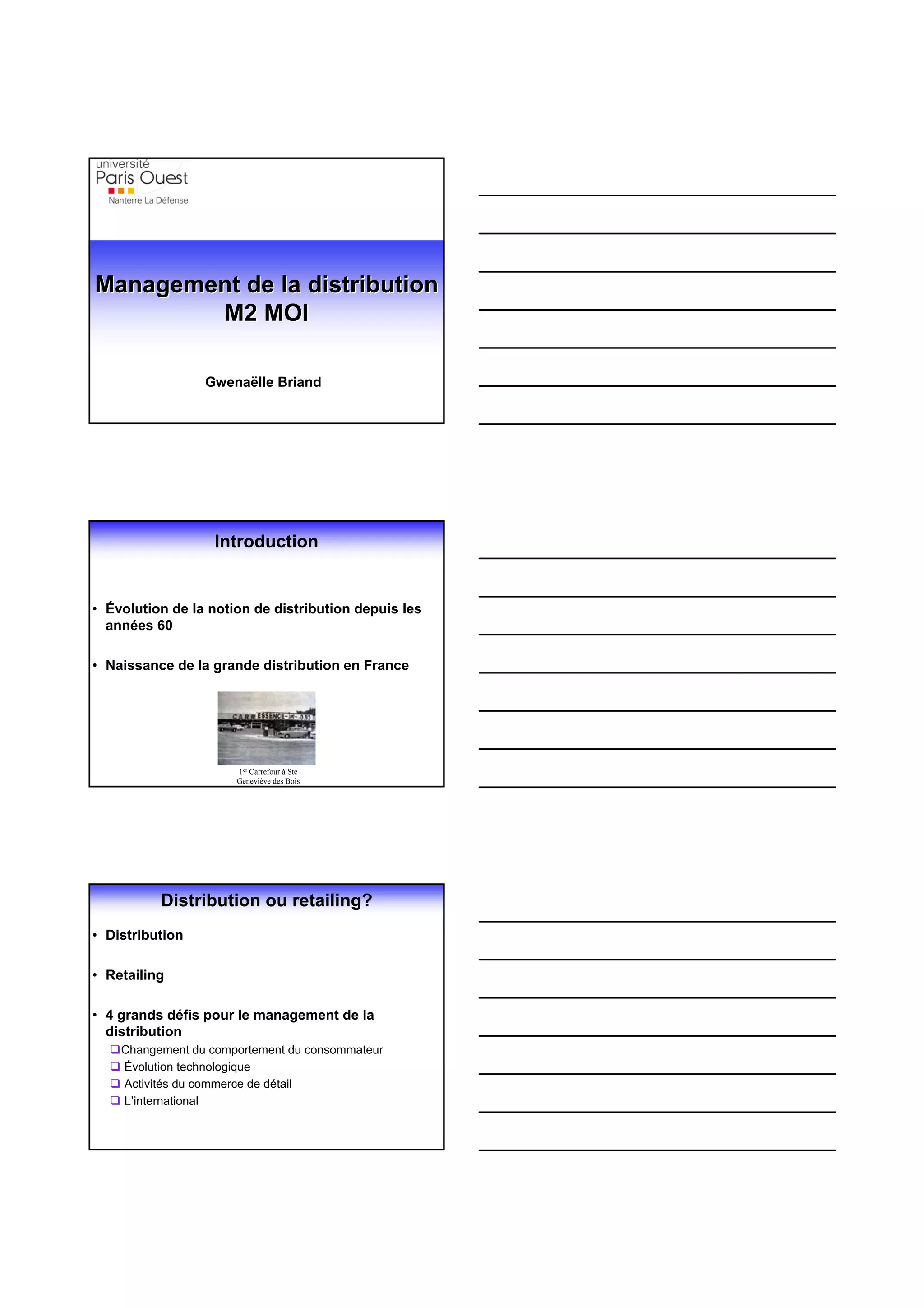 Le document traite de l'évolution de la distribution en France depuis les années 60, mettant en lumière les défis actuels tels que le changement des comportements des consommateurs et l'impact de la technologie. Il aborde également les stratégies d'implantation commerciale, le merchandising et la relation entre producteurs et distributeurs. Enfin, il conclut sur l'importance d'adapter les stratégies marketing aux nouvelles attentes des consommateurs.