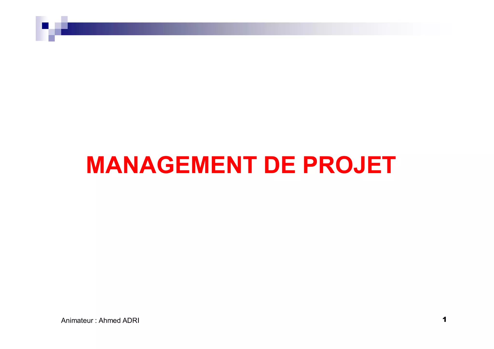 Le document traite de la gestion de projet, incluant ses composantes essentielles comme l'objet, le temps, le coût, la qualité, les ressources et les risques. Il aborde également les méthodes de planification, la gestion des parties prenantes et les structures organisationnelles adaptées, telles que les structures fonctionnelles, commando et matricielles. Enfin, il présente des outils pratiques pour la planification opérationnelle, tels que les méthodes de Gantt et PERT/CPM.