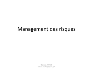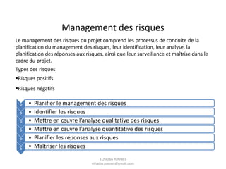 Le document présente les processus de management des risques dans un projet, incluant la planification, l'identification, l'analyse qualitative et quantitative des risques, ainsi que la planification des réponses aux risques. Un risque est défini comme un événement incertain ayant un impact potentiel sur les objectifs du projet, avec des processus spécifiques pour évaluer et gérer ces risques. Les étapes clés incluent la mise en œuvre d'analyses, la planification stratégique des réponses et le suivi des risques tout au long du projet.