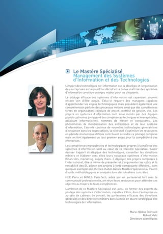 Le mastère spécialisé en management des systèmes d’information et des technologies vise à former des experts capables de gérer les systèmes d’information au sein des entreprises. Il combine des compétences managériales et technologiques pour répondre aux défis contemporains liés à la stratégie et aux processus métiers. Ce programme, proposé par HEC Paris et Mines ParisTech, inclut un enseignement théorique, des stages en entreprise et un travail pratique sur des projets réels.