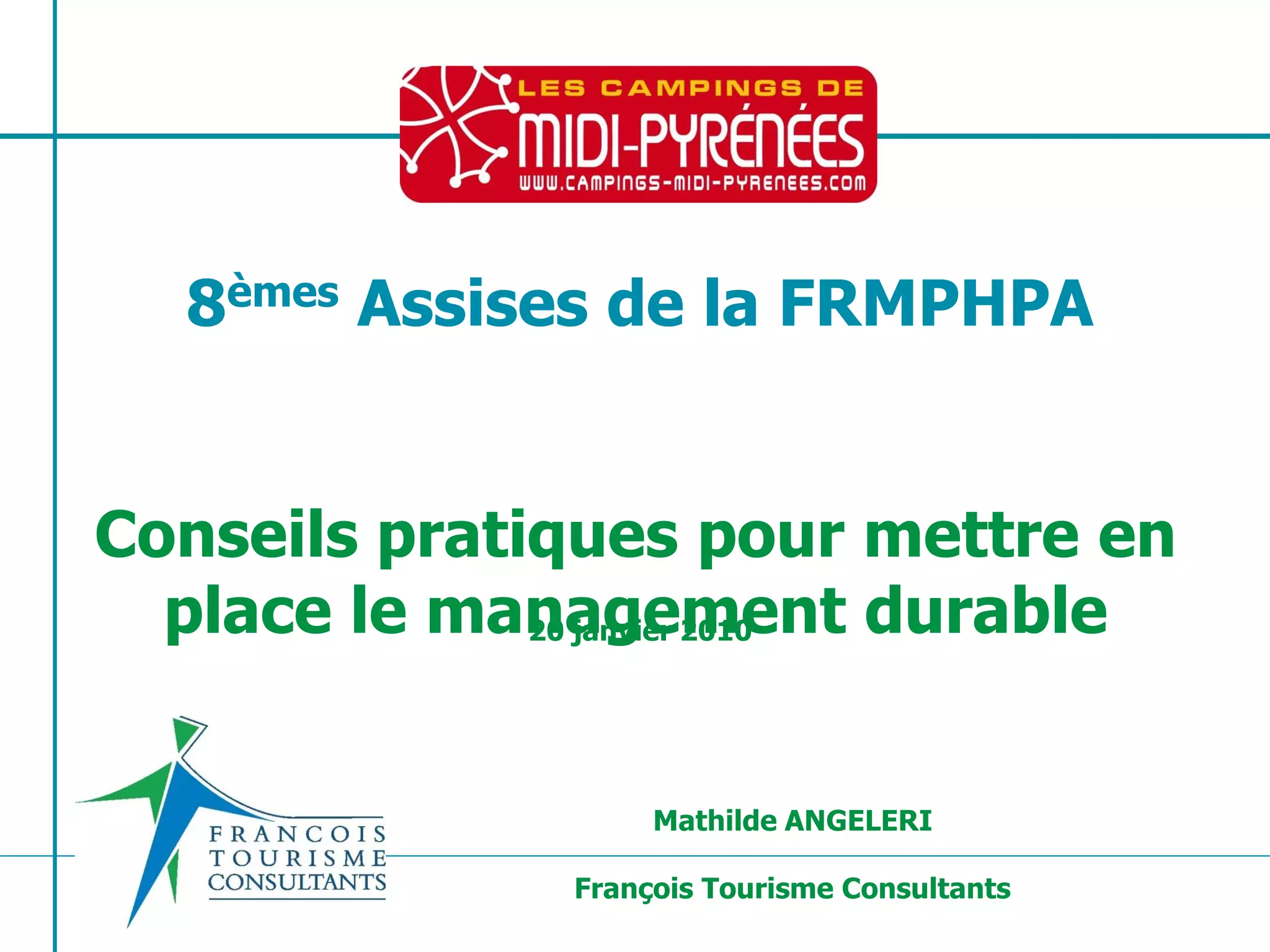 Le document traite du management durable dans le secteur du tourisme, en axant sur la gestion environnementale, l'équité sociale et l'efficacité économique. Il propose des conseils pratiques pour réduire la consommation d'eau et d'énergie, tout en renforçant les compétences des salariés et en intégrant des solutions durables. Des recommandations spécifiques incluent l'utilisation d'équipements économes et des stratégies de sensibilisation auprès des clients.
