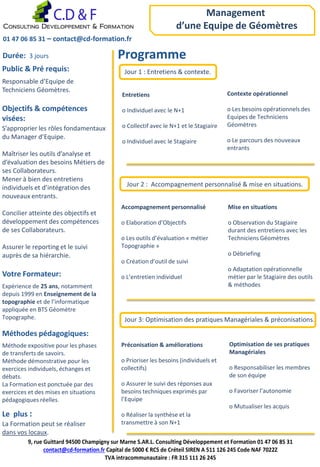 La formation de 3 jours se concentre sur la gestion d'équipe pour les géomètres, abordant les entretiens, l'accompagnement personnalisé, et l'optimisation des pratiques managériales. Les participants apprendront à évaluer les besoins des collaborateurs, établir des objectifs, et mener des suivis efficaces. Le formateur apporte une expérience de 25 ans dans l'enseignement de la topographie et de l'informatique appliquée.