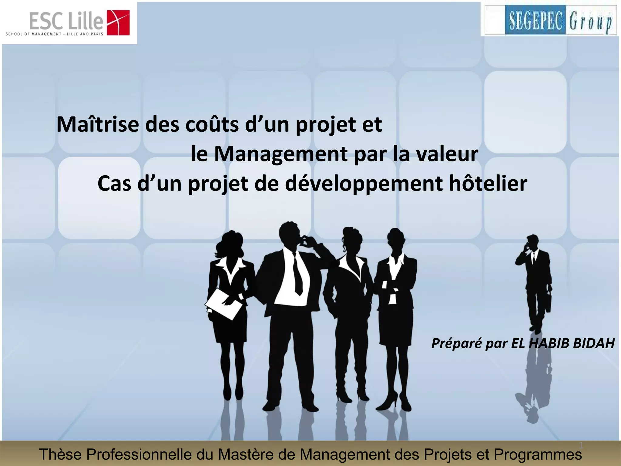 Le document traite de la maîtrise des coûts dans un projet de développement hôtelier, soulignant l'importance d'équilibrer la satisfaction des besoins du client et les ressources allouées. Il présente des méthodologies de gestion des coûts, y compris l'estimation, la budgétisation, et le contrôle des coûts, ainsi que l'approche du management par la valeur pour améliorer l'efficacité des projets. Une étude de cas sur un hôtel 5* à Essaouira illustre des stratégies pour réduire les coûts tout en maintenant la qualité et la satisfaction client.