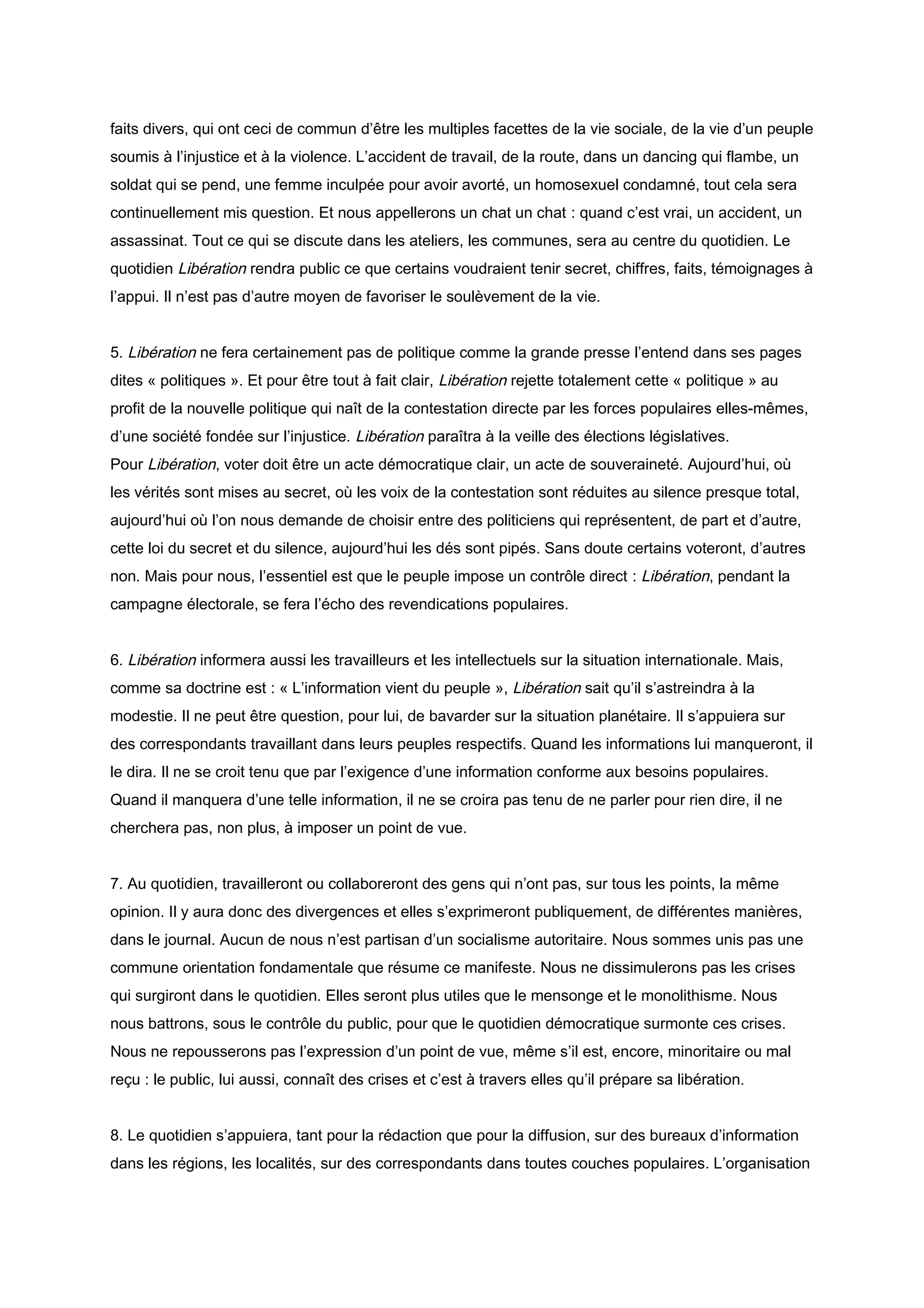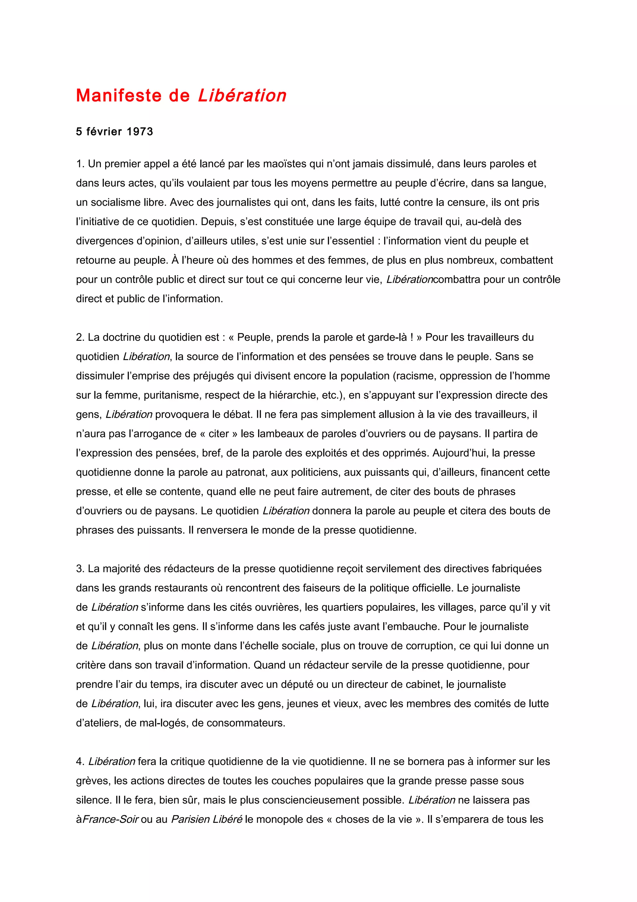 Le manifeste de Libération, daté du 5 février 1973, exprime l'engagement des maoïstes vers un socialisme authentique, centré sur la voix du peuple et contre la censure. Il prône une approche journalistique qui critique les injustices et les abus de pouvoir, tout en favorisant l'expression populaire au lieu de servir les intérêts des puissants. Libération vise à établir un quotidien démocratique, soutenu par la communauté, pour informer sur les luttes sociales et politiques en toute transparence.