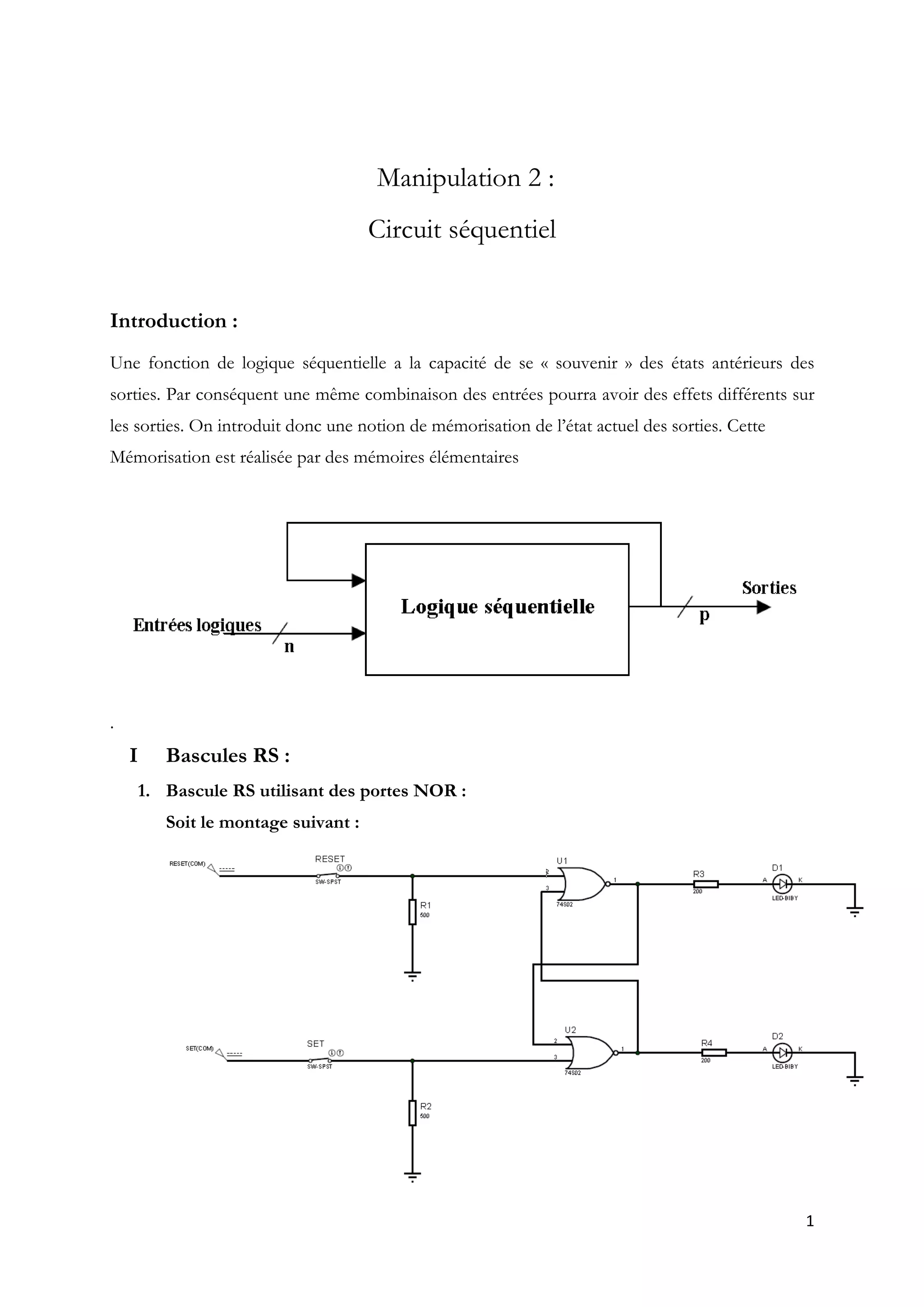 Le document traite des circuits séquentiels, introduisant des fonctions de logique qui mémorisent les états antérieurs des sorties via des mémoires élémentaires. Il explore différentes configurations de bascules RS, asynchrones et synchrones, en demandant la réalisation de montages et la complétion de tables de vérité. Enfin, il aborde l'utilisation de compteurs modulo et de simulateurs pour visualiser le fonctionnement des circuits.