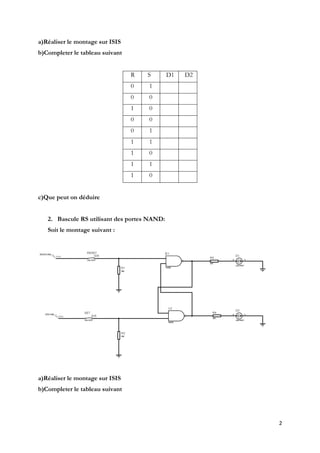 Le document traite des circuits séquentiels, en mettant l'accent sur les bascules RS, leur réalisation avec des portes NOR et NAND, ainsi que sur la synchronisation et la mémorisation des états. De plus, il aborde la conception de compteurs-décateurs asynchrones et synchrones, fournissant des instructions pour créer des montages, compléter des tables de vérité et simuler des circuits. Les aspects pratiques incluent l'utilisation de simulateurs comme ISIS et des composants comme le 74HC107 et le decodeur BCD/7seg 4511.