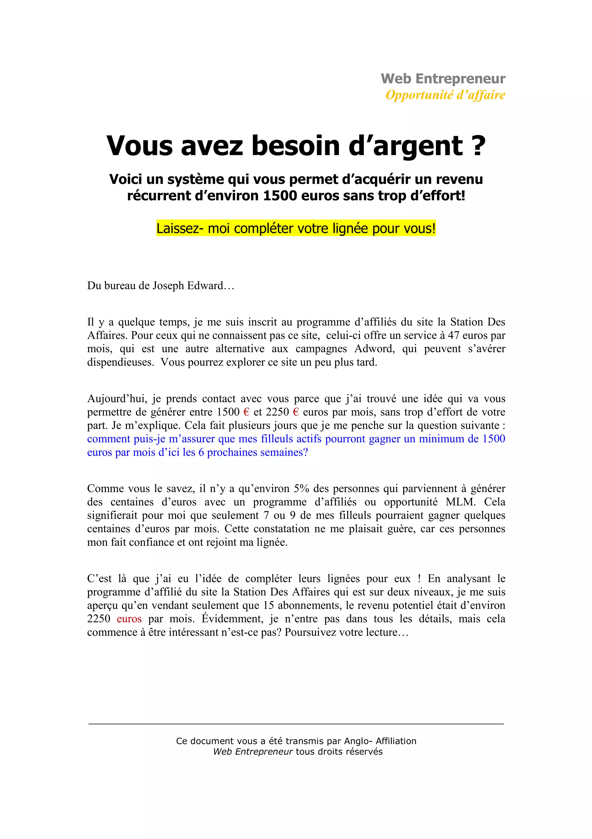 Le document présente un programme d'affiliation promettant un revenu récurrent de 1500 à 2250 euros par mois en échange d'un investissement mensuel de 47 euros. L'auteur, Joseph Edward, propose de compléter les lignées des filleuls pour assurer leur succès, en plaçant stratégiquement les nouveaux membres dans la matrice. Il souligne l'importance de faire participer les membres en parrainant six personnes pour bénéficier pleinement du système.