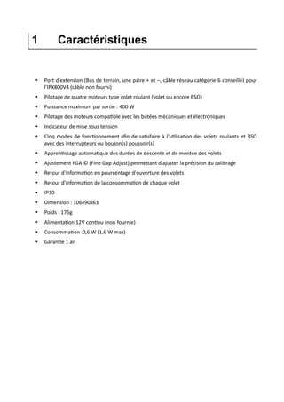 Le mode d'emploi de la x-4vr version 1.0 décrit les fonctionnalités et l'installation d'une extension pour le pilotage de volets roulants avec l'ipx800v4. Il permet de contrôler jusqu'à 32 volets roulants et propose plusieurs modes de fonctionnement ainsi que des précautions d'usage pour éviter les risques électriques. Pour toute question ou problème technique, des ressources de support sont disponibles, y compris un forum et une hotline.