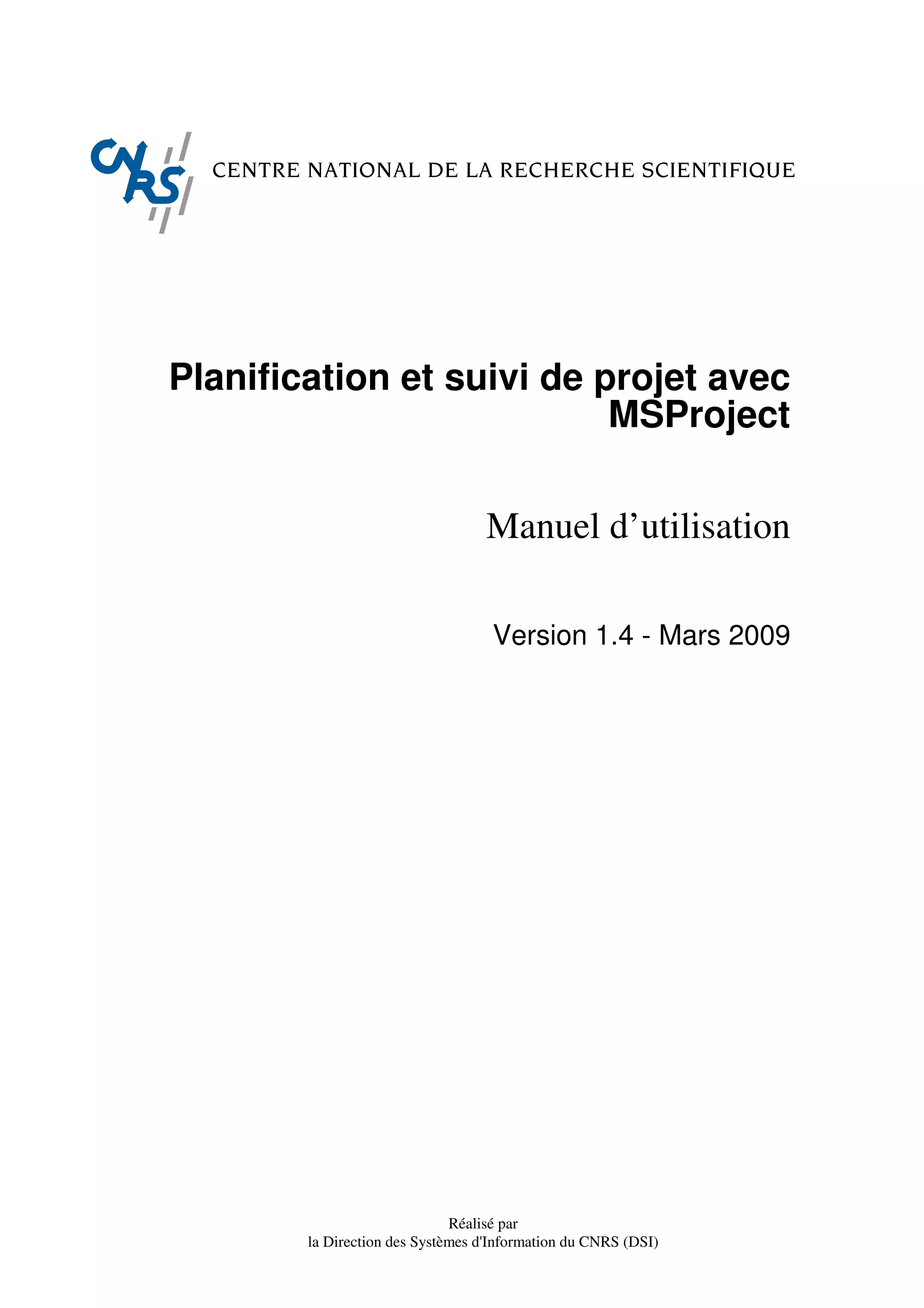 Ce manuel d'utilisation de MS Project, version 1.4, décrit les principes de planification et de suivi de projet à l'aide du logiciel MS Project 2002. Il aborde la création d'un planning, les étapes nécessaires pour construire et mettre à jour celui-ci, ainsi que des recommandations pour une gestion efficace des tâches et des ressources. Enfin, il fournit des informations sur le suivi de projet et des outils utiles pour les utilisateurs.
