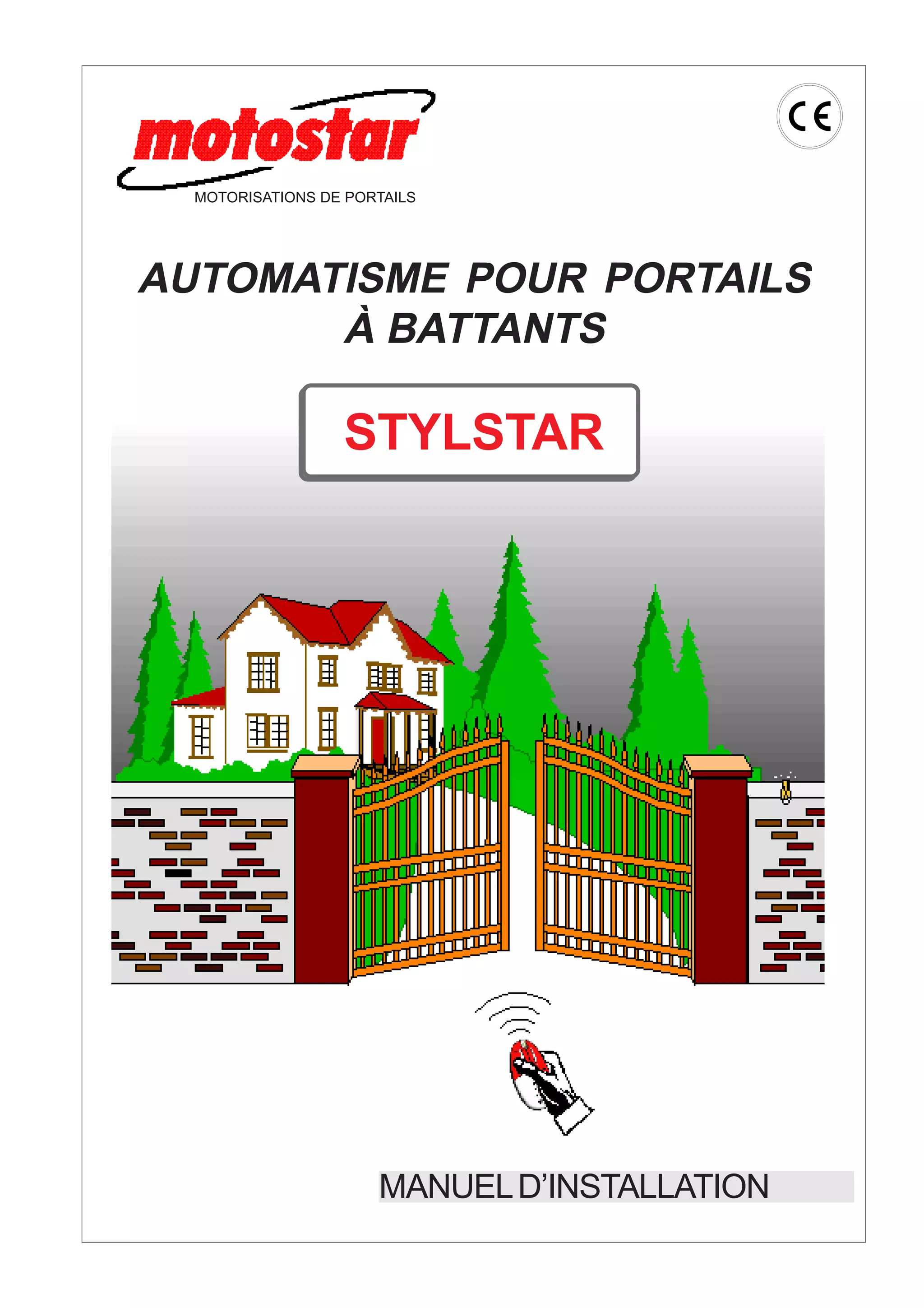 Ce document est un manuel d'installation pour un système de motorisation de portails à battants, détaillant les caractéristiques techniques, les composants nécessaires, et les étapes d'installation et de réglage. Il inclut des informations sur l'armoire de commande, les motoréducteurs, les raccordements électriques et des fonctions de sécurité. Des instructions précises pour le test et la programmation du système sont également fournies.