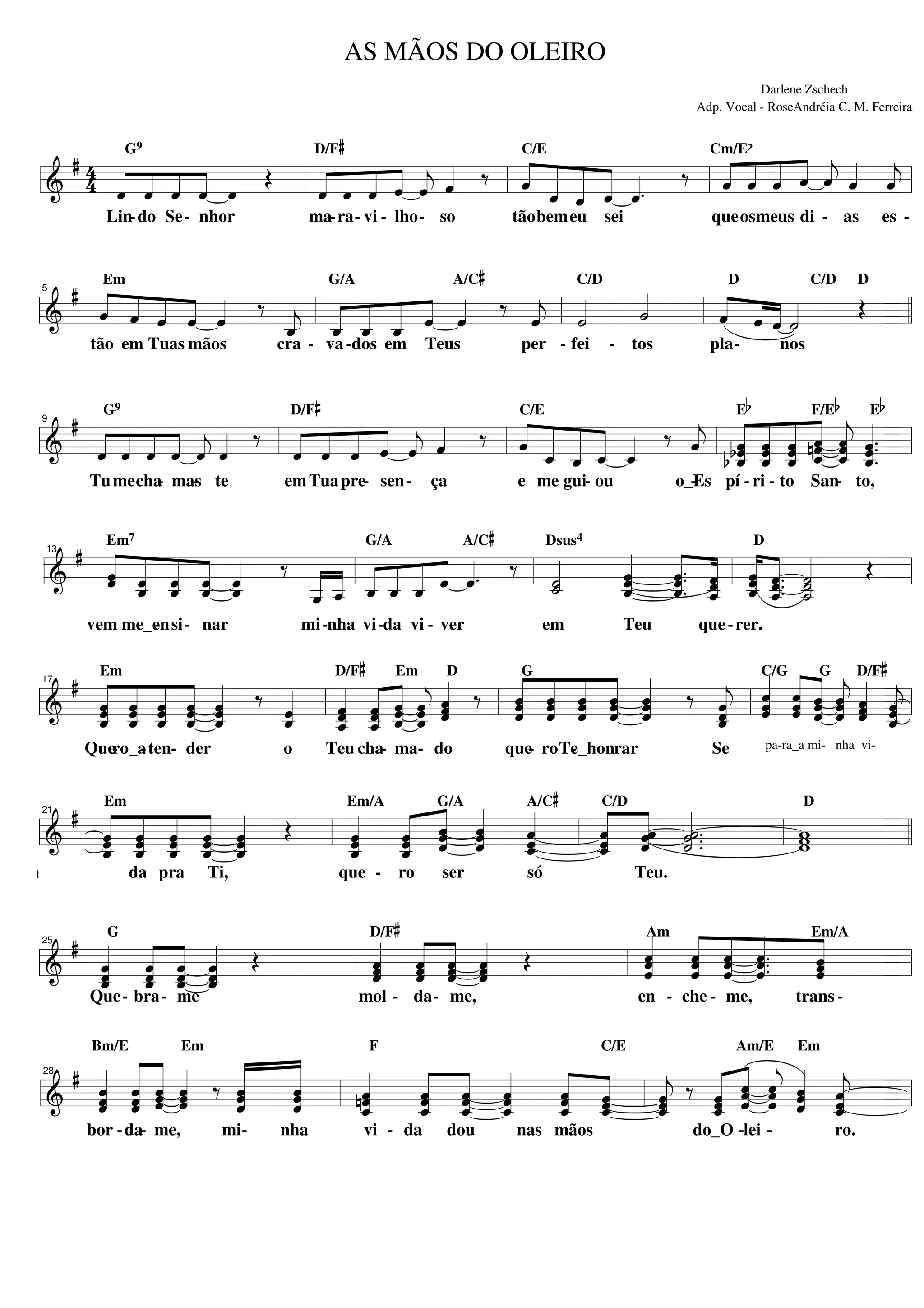 Le document contient les paroles de la chanson "As Mãos do Oleiro" de Darlene Zschech, interprétée par Roseandréia. Les paroles évoquent la soumission et la transformation spirituelle, soulignant que la vie et les aspirations sont entre les mains de Dieu, le potier. Le texte est riche en métaphores liées à l'argile et au façonnement de la vie personnelle.