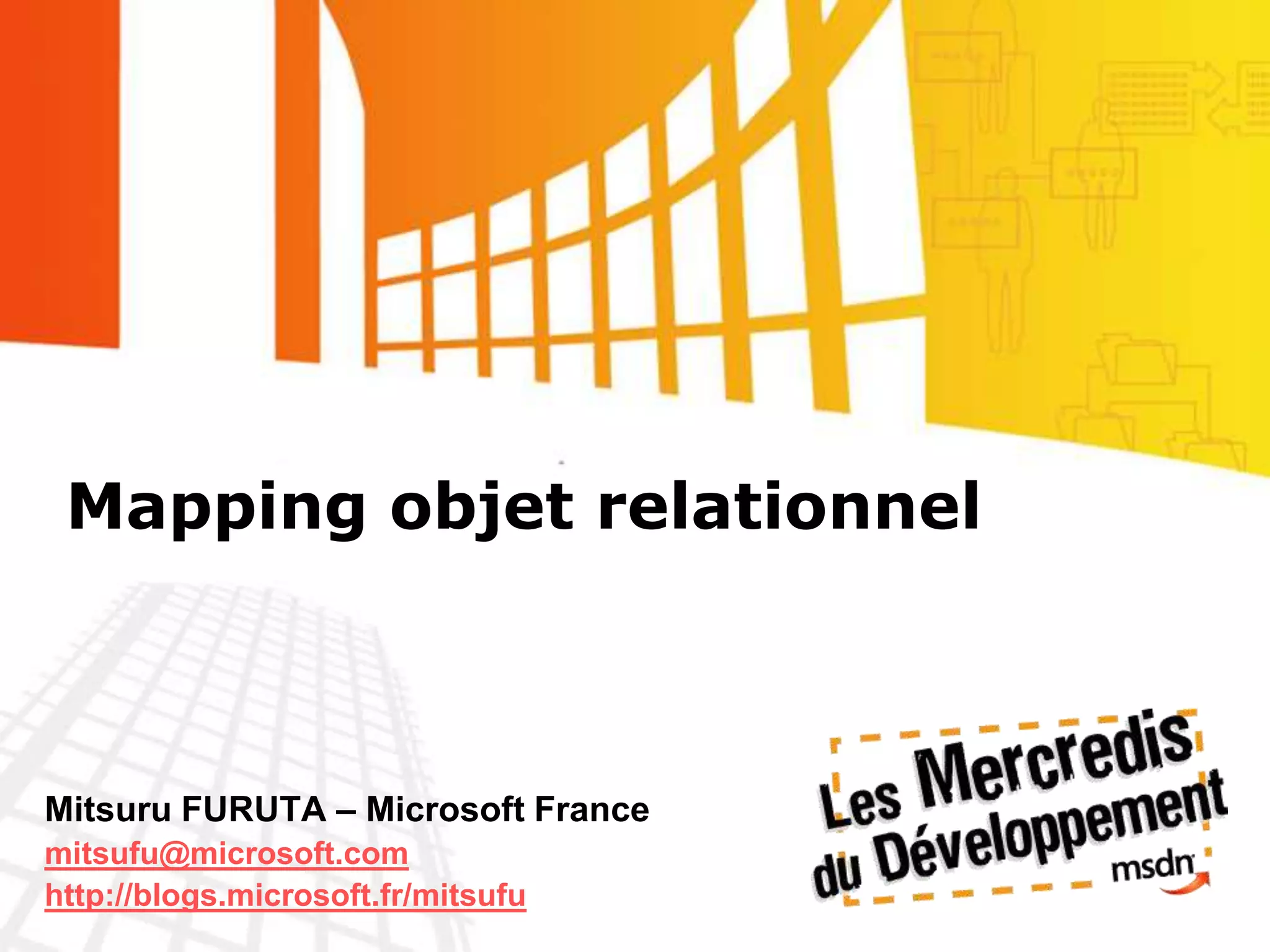 La présentation technique aborde le mapping objet-relationnel (O/R), mettant en lumière les enjeux, les architectures et les fonctionnalités attendues de la couche objet. Elle discute des problématiques liées à l'automatisation de la DAL, la performance, et les différentes solutions de mapping existantes. En conclusion, elle propose une solution indépendante des sources de données, optimisée pour la performance et intégrant des fonctionnalités avancées de databinding.