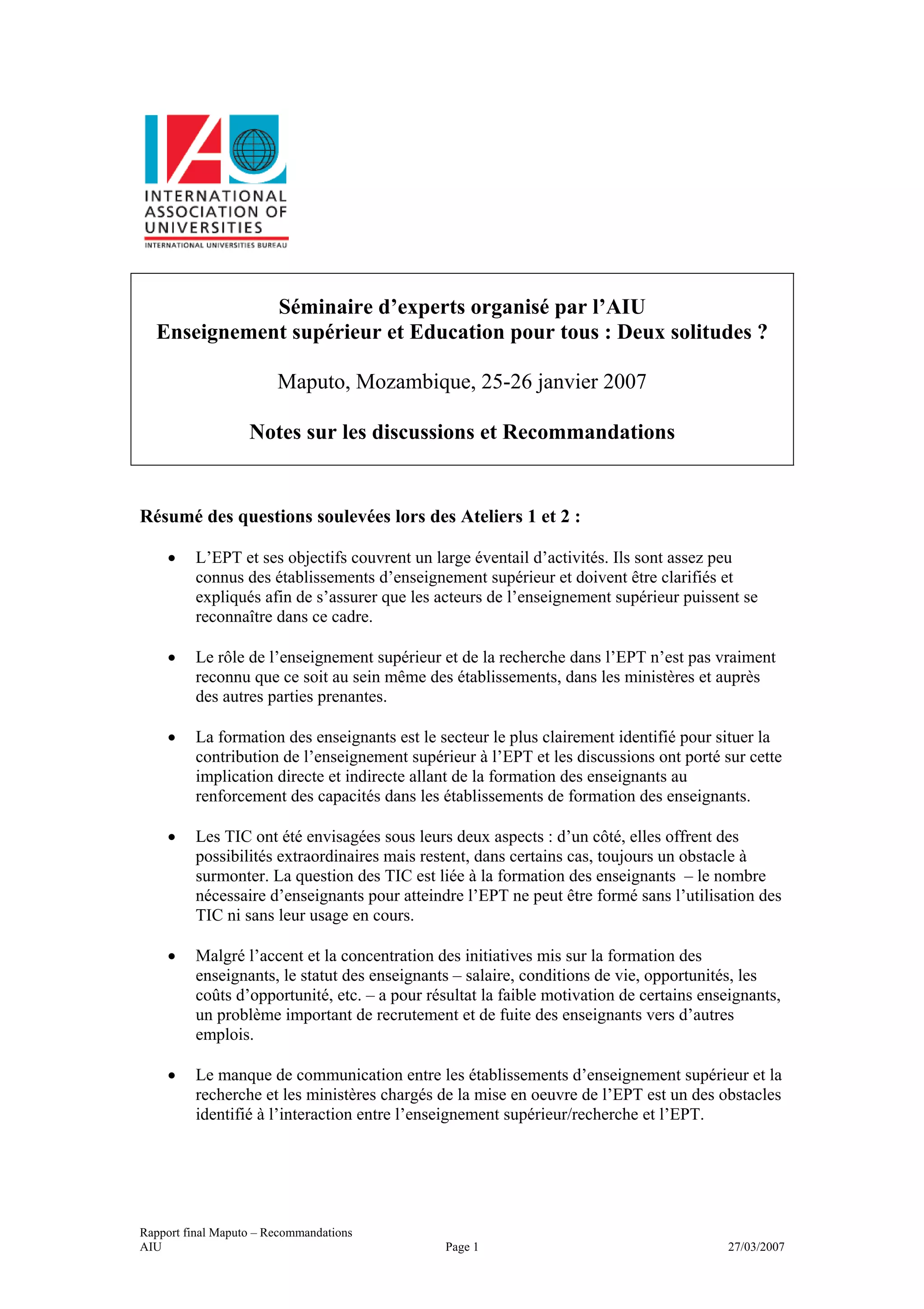 Le séminaire d'experts sur l'éducation pour tous et l'enseignement supérieur a révélé que la contribution de l'enseignement supérieur à l'EPT est souvent méconnue, malgré son importance pour la formation des enseignants et l'utilisation des technologies de l'information et de la communication. Des recommandations ont été formulées pour renforcer la collaboration entre établissements d'enseignement supérieur et parties prenantes afin d'améliorer la visibilité et l'efficacité de leurs contributions à l'EPT. Un accent particulier a été mis sur la nécessité d'une meilleure articulation des systèmes éducatifs et la sensibilisation des responsables à l'importance de l'enseignement supérieur dans l'atteinte des objectifs de l'EPT.