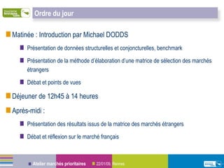 L'atelier sur les marchés prioritaires à Rennes a permis d'élaborer une stratégie marketing pour la Bretagne de 2009 à 2011, axée sur un positionnement clair de la région comme destination touristique authentique et responsable. Les actions proposées incluent le développement d'une stratégie de promotion cohérente, des partenariats renforcés et une évaluation continue des outils de communication. L'analyse des données touristiques a mis en évidence la nécessité de cibler efficacement différents segments de marché pour améliorer la fréquentation et les nuitées.