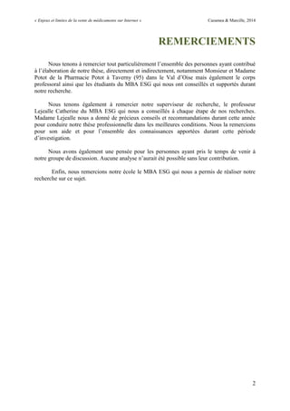 Ce document explore les enjeux et limites de la vente de médicaments sur internet dans le cadre d'une thèse professionnelle. L'étude met en lumière le faible taux d'achat en ligne de médicaments en France, malgré l'accroissement des pratiques numériques, et discute des implications pour les consommateurs et les pharmacies. Des recommandations managériales sont également proposées pour aider une pharmacie spécifique, la pharmacie Potot, à développer sa présence en ligne.