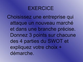 Le document traite des stratégies de marketing et de communication à travers l'analyse SWOT et la segmentation de marché. Il explique les divers types de segmentation (géographique, démographique, socioculturelle, comportementale) et les différences entre segmentation et ciblage. Il présente également plusieurs stratégies de marketing, allant de la stratégie indifférenciée au marketing sur mesure.