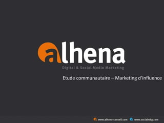 Alhena propose des études communautaires en marketing d'influence pour aider les marques à développer leur visibilité et notoriété en ligne. Ces études comprennent l'analyse des communautés de blogueurs, l'identification des influenceurs spécifiques et une analyse sémantique des thèmes abordés. Les résultats sont livrés sous forme de présentations et de bases de données, permettant aux clients de mettre en place des stratégies de social media marketing.