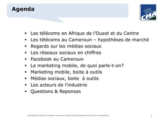 Le document traite de l'optimisation des actions marketing via le marketing mobile et les médias sociaux, en se concentrant sur le marché des télécommunications en Afrique de l'Ouest et du Centre, avec des statistiques sur la croissance des abonnés. Il présente également des outils pour le marketing mobile et les médias sociaux, soulignant l'importance d'une stratégie intégrée pour atteindre le consommateur de manière ciblée et efficace. Des données spécifiques sur l'utilisation de Facebook au Cameroun et les tendances du marketing mobile y sont incluses.