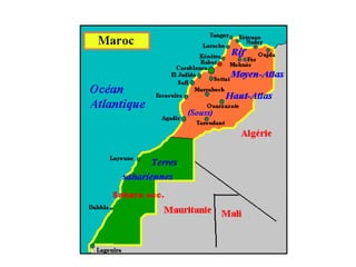 Le Maroc est un état situé au nord-ouest de l'Afrique, avec Rabat comme capitale et une population de 29,1 millions d'habitants en 2000. Les principales villes incluent Marrakech, célèbre pour son authenticité et son tourisme, Casablanca, le centre économique, et Fès, la capitale culturelle. Le pays est caractérisé par une diversité de paysages et un riche patrimoine culturel, incluant des sites classés au patrimoine mondial de l'UNESCO.
