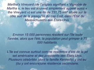 Martha's Vineyard, une île de 231,75 km² au sud de Cap Cod dans le Massachusetts, est connue comme résidence d'été pour la jet set américaine, y compris des présidents et des célébrités comme la famille Kennedy. L'île a une riche histoire liée à la chasse à la baleine au XIXe siècle, qui a décliné après la découverte du pétrole. Aujourd'hui, Martha's Vineyard combine des communautés de pêcheurs traditionnelles avec des villes animées comme Vineyard Haven et Edgartown, et est accessible par ferry depuis Cape Cod.
