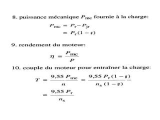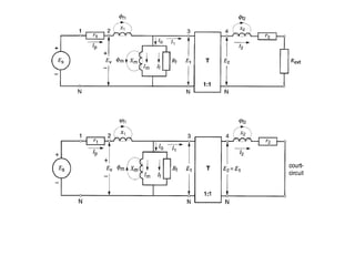 Le document décrit le circuit équivalent d'un moteur asynchrone à rotor bobiné à l'arrêt, en détaillant les composants clés tels que les résistances, réactances et tensions. Il présente également des relations dérivées du circuit équivalent, en suggérant des adaptations pour des moteurs de puissance supérieure ou égale à 3 kW. Ce modèle est essentiel pour comprendre les caractéristiques et les performances des moteurs asynchrones.