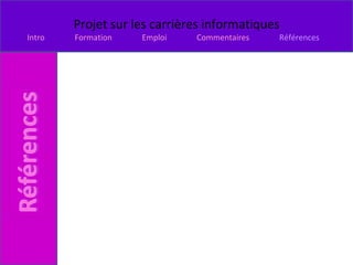 Le document présente plusieurs carrières dans le domaine de l'informatique et des disciplines connexes, tels que programmeur informatique, développeur de jeux vidéo, et statisticien, avec des variations de salaires et exigences éducatives. Chaque carrière est accompagnée d'une brève description des responsabilités et de l'intérêt personnel de l'auteur pour chaque métier. L'auteur ne montre pas d'intérêt pour certaines carrières, tandis qu'il exprime un intérêt pour le métier de statisticien en raison de sa passion pour les mathématiques.