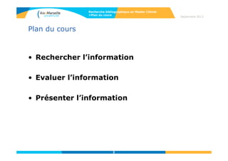 Ce document présente un cours de recherche bibliographique pour un master en chimie, abordant des méthodologies pour rechercher, évaluer et présenter l'information. Il détaille les outils et bases de données disponibles pour trouver des informations pertinentes, ainsi que des techniques de recherche avancée. Les participants apprennent à formuler des mots-clés et à naviguer dans les catalogues et ressources électroniques pour accéder aux documents nécessaires.