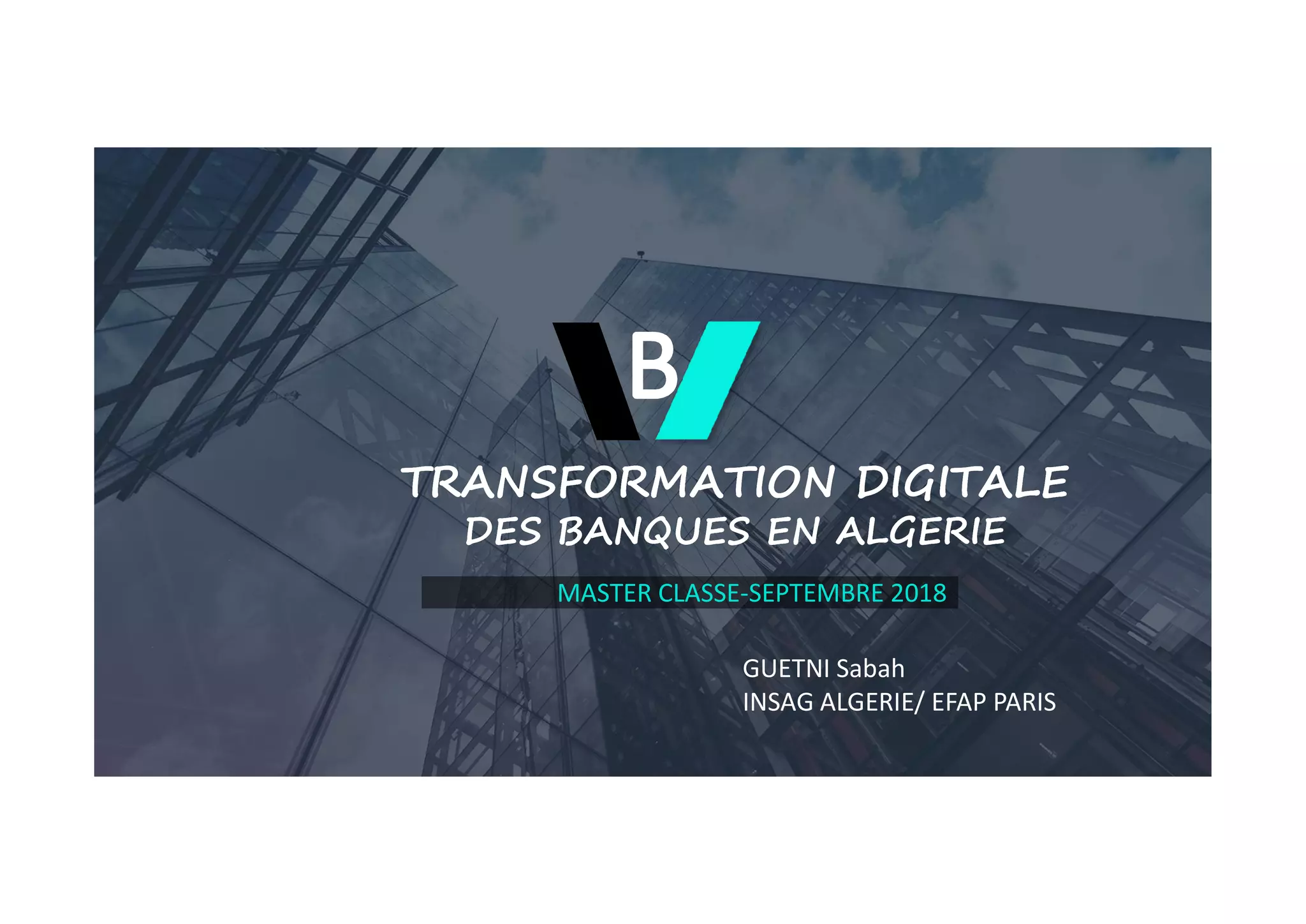 Le document traite de la transformation digitale des banques en Algérie, soulignant leur évolution depuis l'informatisation jusqu'à l'ère numérique. Il aborde les différents types de banques, leurs caractéristiques, et les défis auxquels elles font face, notamment la faible bancarisation et la nécessité d'adaptation aux nouvelles technologies. L'analyse met en évidence l'importance de la digitalisation pour l'avenir du secteur bancaire algérien et son positionnement sur le marché africain.