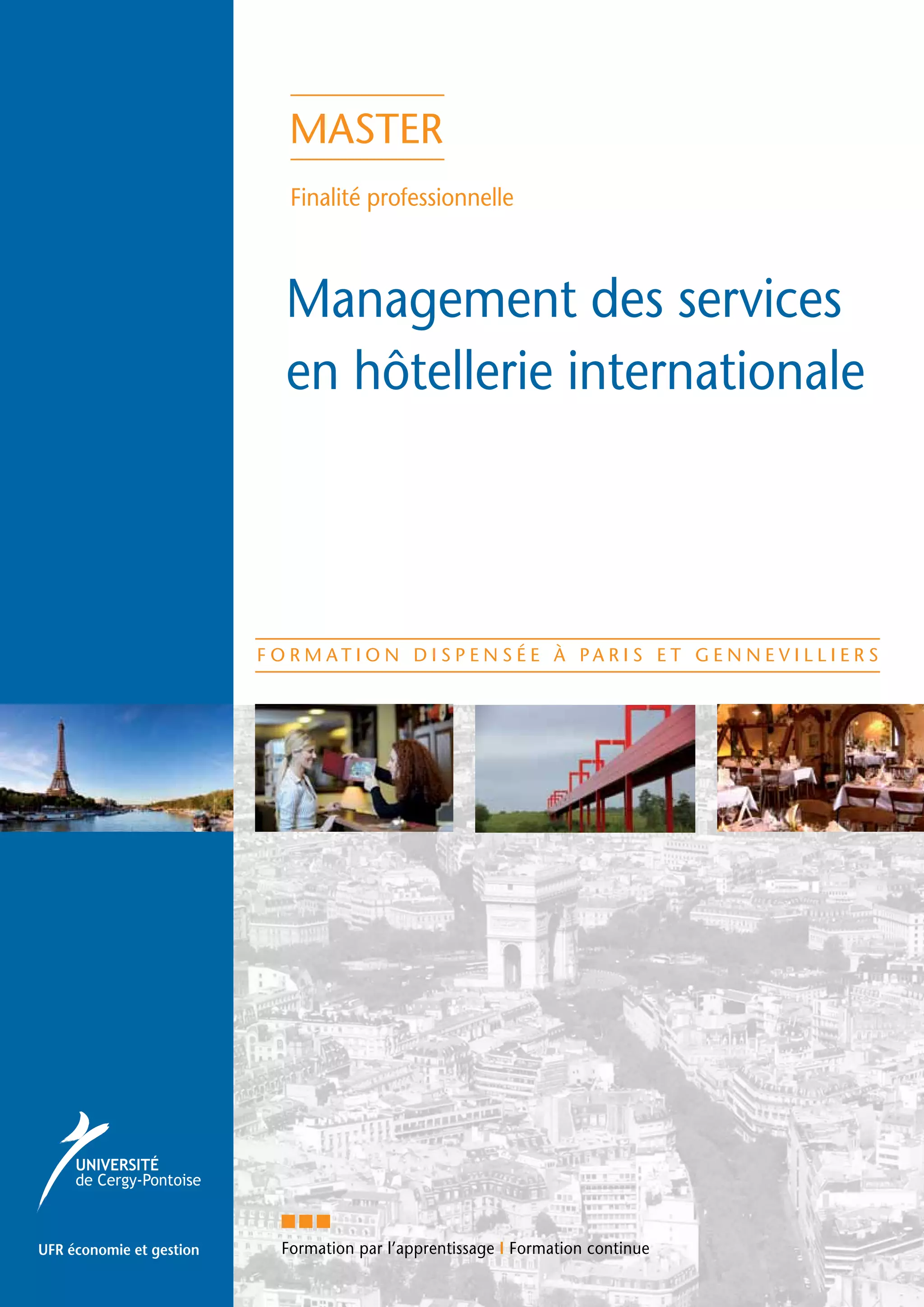 Le Master en Management des Services en Hôtellerie Internationale vise à former des cadres compétents dans le secteur hôtelier, capable de gérer des équipes multiculturelles et d'optimiser les opérations. Cette formation de deux ans inclut des cours théoriques et pratiques, avec un accent sur la qualité de service et les responsabilités managériales. Les diplômés seront préparés à exercer des fonctions variées telles que community manager, revenue manager ou directeur d'hôtel.