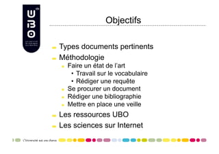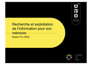 Le document explique la méthodologie de recherche et d'exploitation de l'information pour un mémoire de master, en détaillant les objectifs, les types de documents pertinents et les outils disponibles. Il couvre des ressources telles que les catalogues de bibliothèques, les bases de données, et les moteurs de recherche spécialisés pour faciliter l'accès aux documents. Enfin, il présente des conseils sur l'utilisation des opérateurs booléens et la rédaction de bibliographies selon différentes normes.