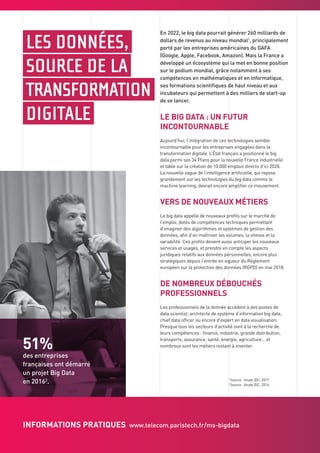 Le mastère spécialisé® en big data de Télécom ParisTech forme des professionnels capables de gérer et analyser des données massives tout en intégrant des compétences techniques et juridiques. En réponse à la demande croissante de compétences en big data, le programme s'adresse aux diplômés d'un bac +5 et met l'accent sur l'acquisition de savoir-faire opérationnels et la création de valeur data-driven. Les diplômés du programme bénéficient d'un fort taux d'employabilité, avec des carrières dans divers secteurs tels que la finance, l'énergie et la santé.