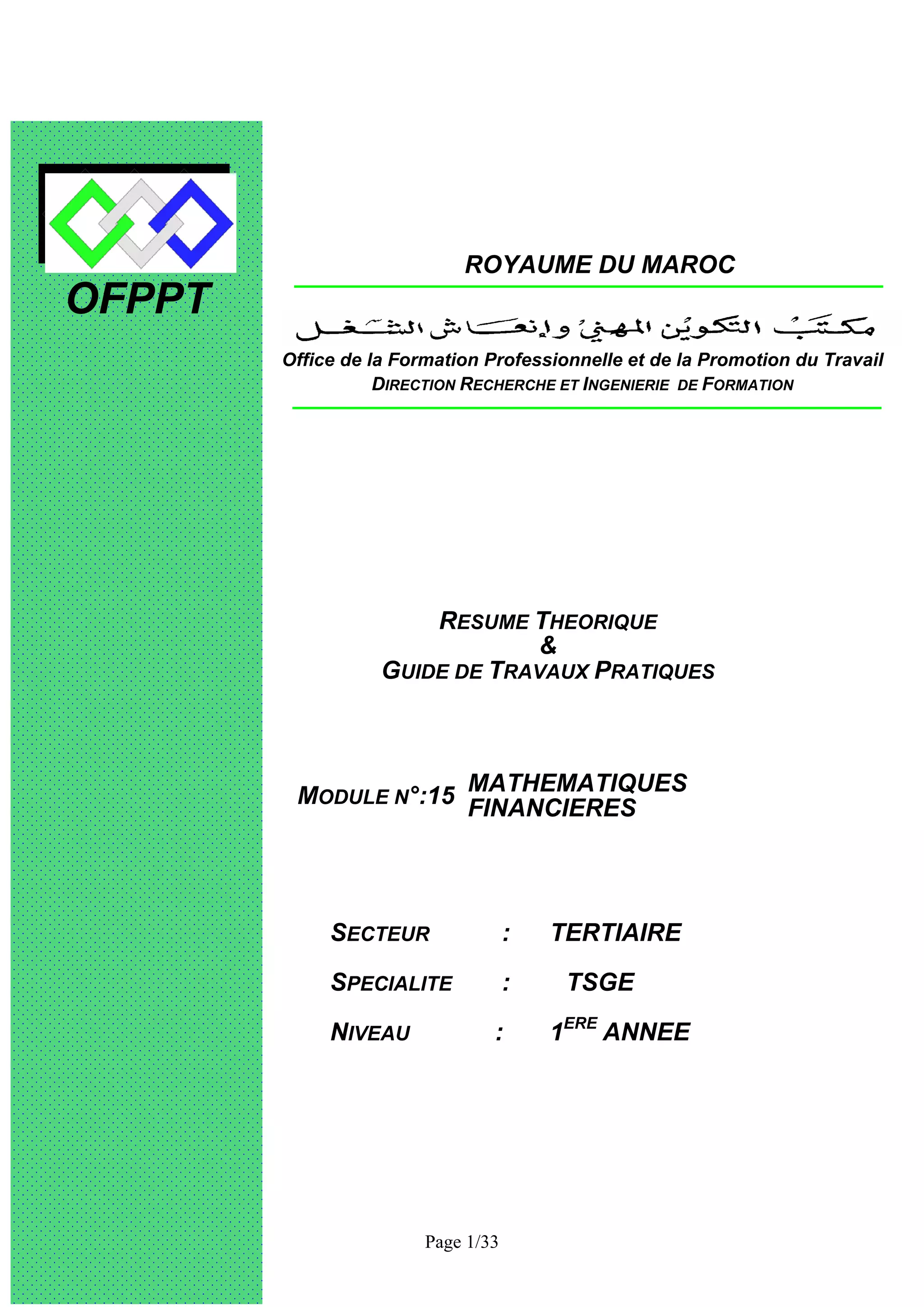 Le document présente un module de formation sur les mathématiques financières, se concentrant sur les intérêts simples et composés, les calculs associés, et leur application pratique dans le secteur tertiaire. Il décrit les conditions d'évaluation, les principes de gestion du temps, et les méthodes de calcul des intérêts ainsi que les concepts clés tels que la valeur actuelle et la capitalisation. Les informations visent à permettre aux stagiaires d'appliquer ces principes en situations réelles pour démontrer leurs compétences en gestion financière.
