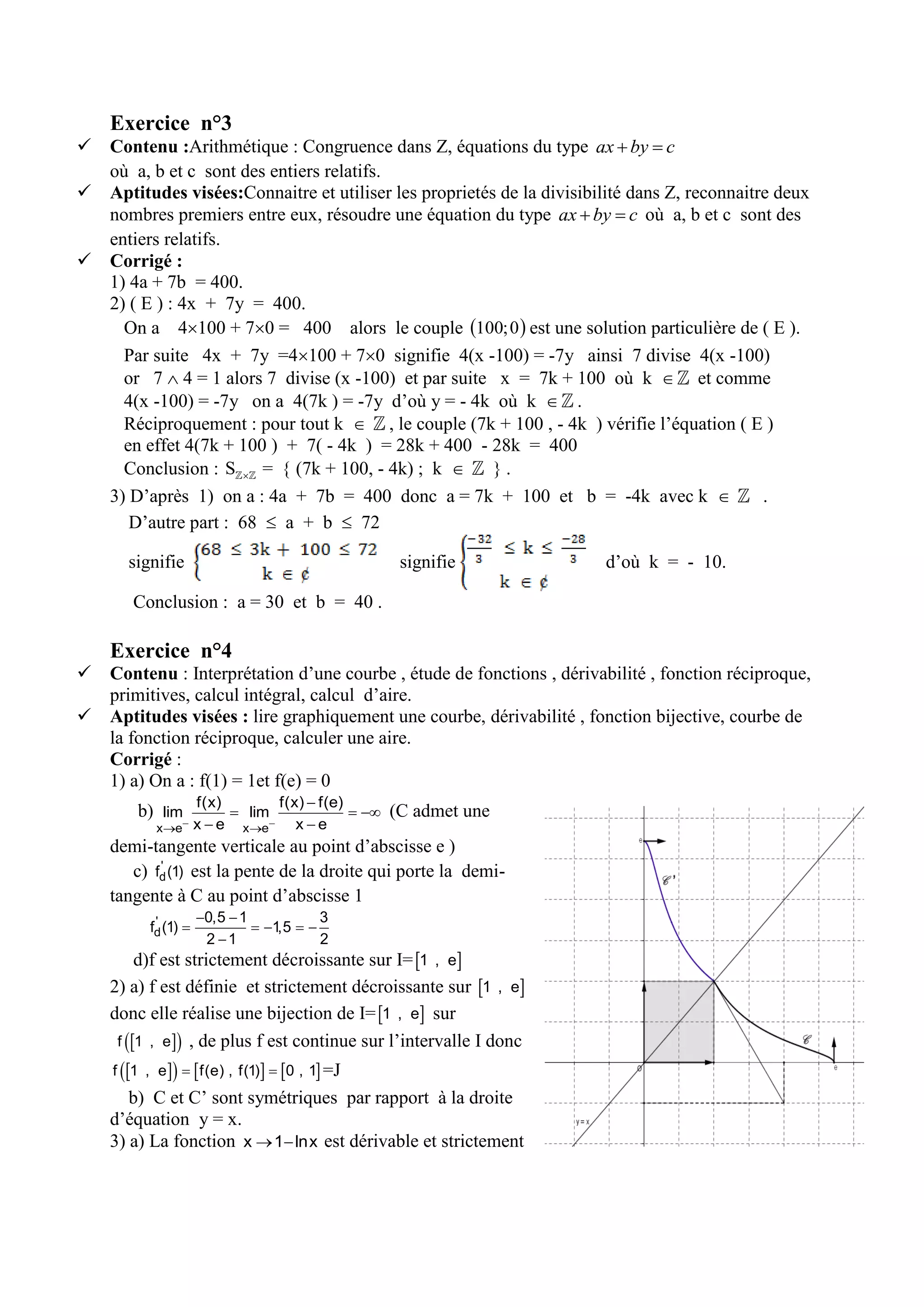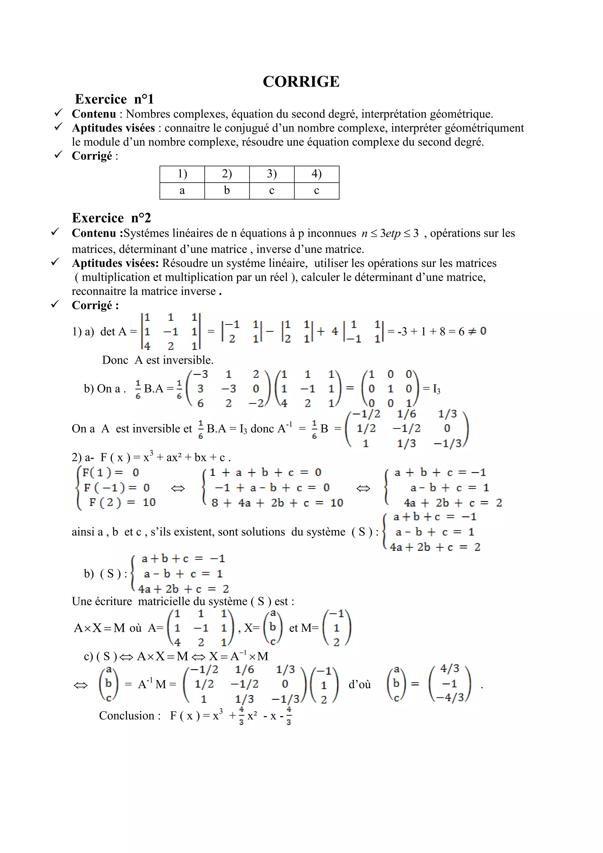 Le document présente des exercices de mathématiques abordant les nombres complexes, les systèmes linéaires, l'arithmétique, et l'étude des fonctions. Chaque exercice détaille les contenus et aptitudes visées, suivis de corrections explicatives. Les thèmes incluent notamment la résolution d'équations complexes et linéaires, la dérivabilité, ainsi que le calcul intégral et d'aire.