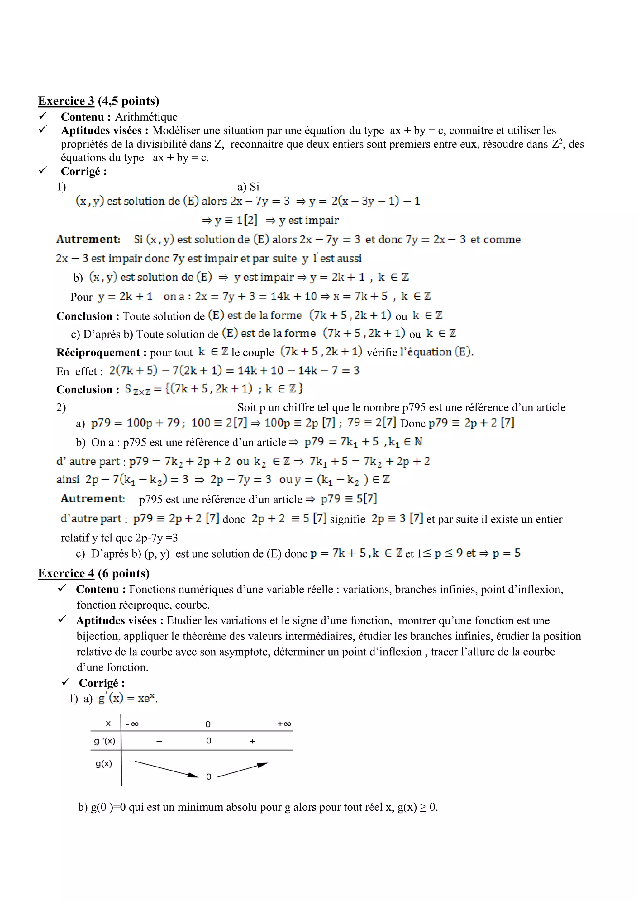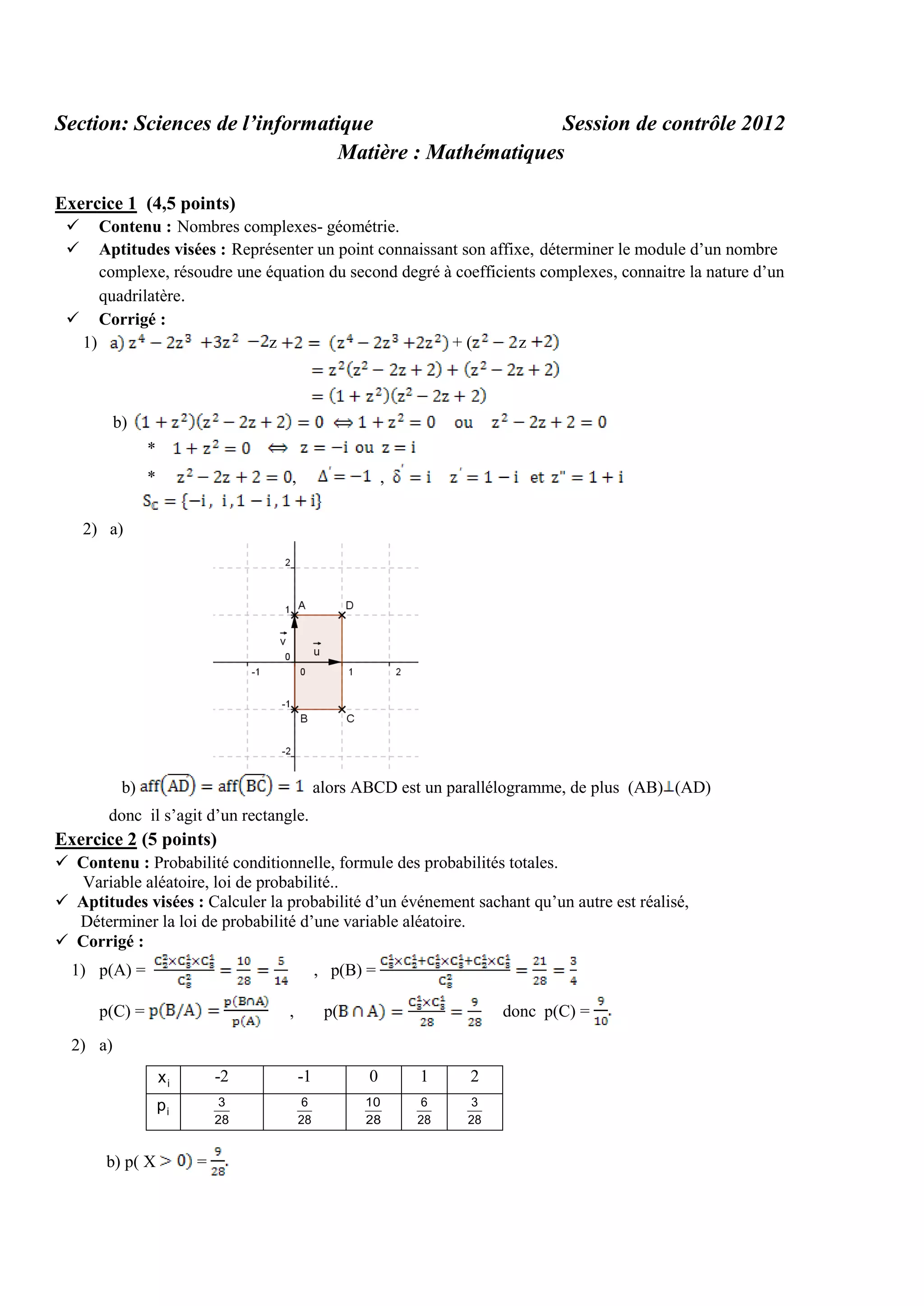 Le document présente un exercice de contrôle en mathématiques pour les sciences de l'informatique, portant sur les nombres complexes, les probabilités conditionnelles, l'arithmétique, et les fonctions numériques. Chaque exercice inclut des aptitudes visées et une correction détaillée. Les thèmes abordés comprennent la représentation de points, la résolution d'équations, et l'étude des variations de fonctions.