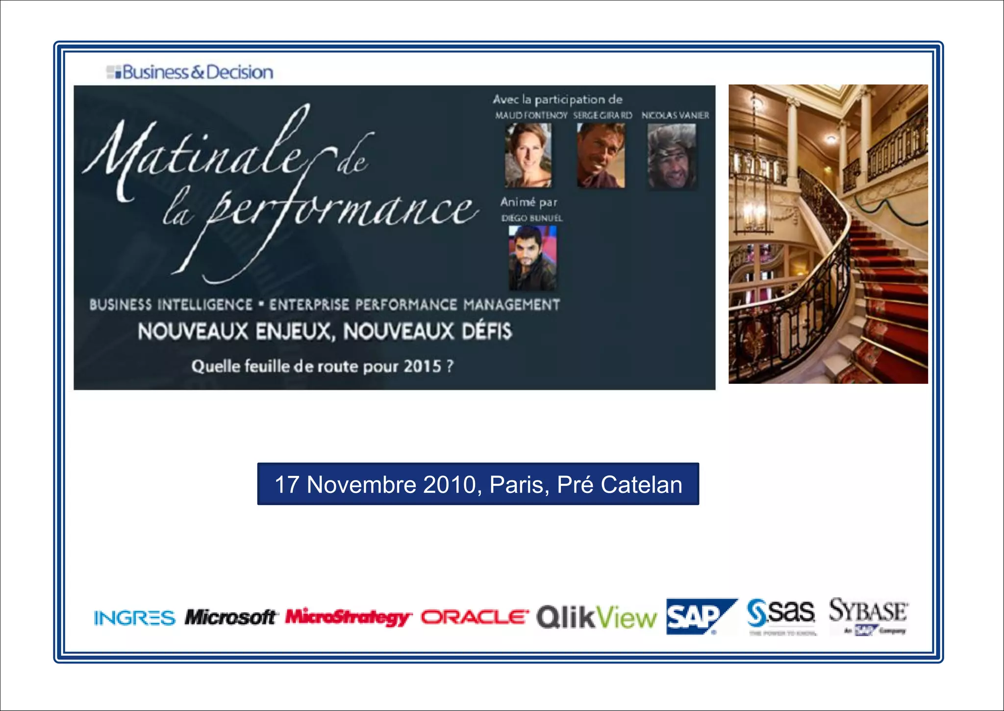 Le séminaire organisé par Business & Decision vise à rassembler les acteurs de la business intelligence et de la gestion de la performance pour partager des pratiques et expertises. Il présente également les défis et innovations dans ces domaines, abordant notamment les tendances futuristes, l'intégration des données, et le pilotage des entreprises en période de turbulences économiques. Business & Decision, fondée en 1992, propose des solutions diversifiées et est active dans 19 pays avec plus de 2500 employés.