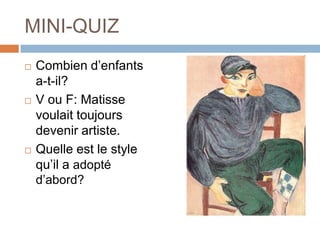 Henri Matisse, né le 31 décembre 1869 et mort le 3 novembre 1954, était un peintre et sculpteur associé au post-impressionnisme et connu comme le chef du fauvisme, un mouvement artistique caractérisé par des couleurs vives et des formes abstraites. Il a étudié l'art à Paris et a été influencé par l'impressionnisme avant de développer son propre style. Matisse a eu trois enfants avec sa femme Amélie Noellie Parayre et une fille avec une autre femme.