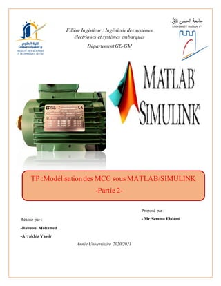 Ce document traite de la simulation d'un moteur à courant continu à l'aide de MATLAB/Simulink, en se basant sur des équations électriques et électromécaniques. Il explique le principe de modulation par largeur d'impulsions (PWM) pour contrôler la vitesse du moteur et les méthodes de commande associées. Enfin, il présente des résultats de simulation et des analyses des performances du moteur sous différentes conditions.