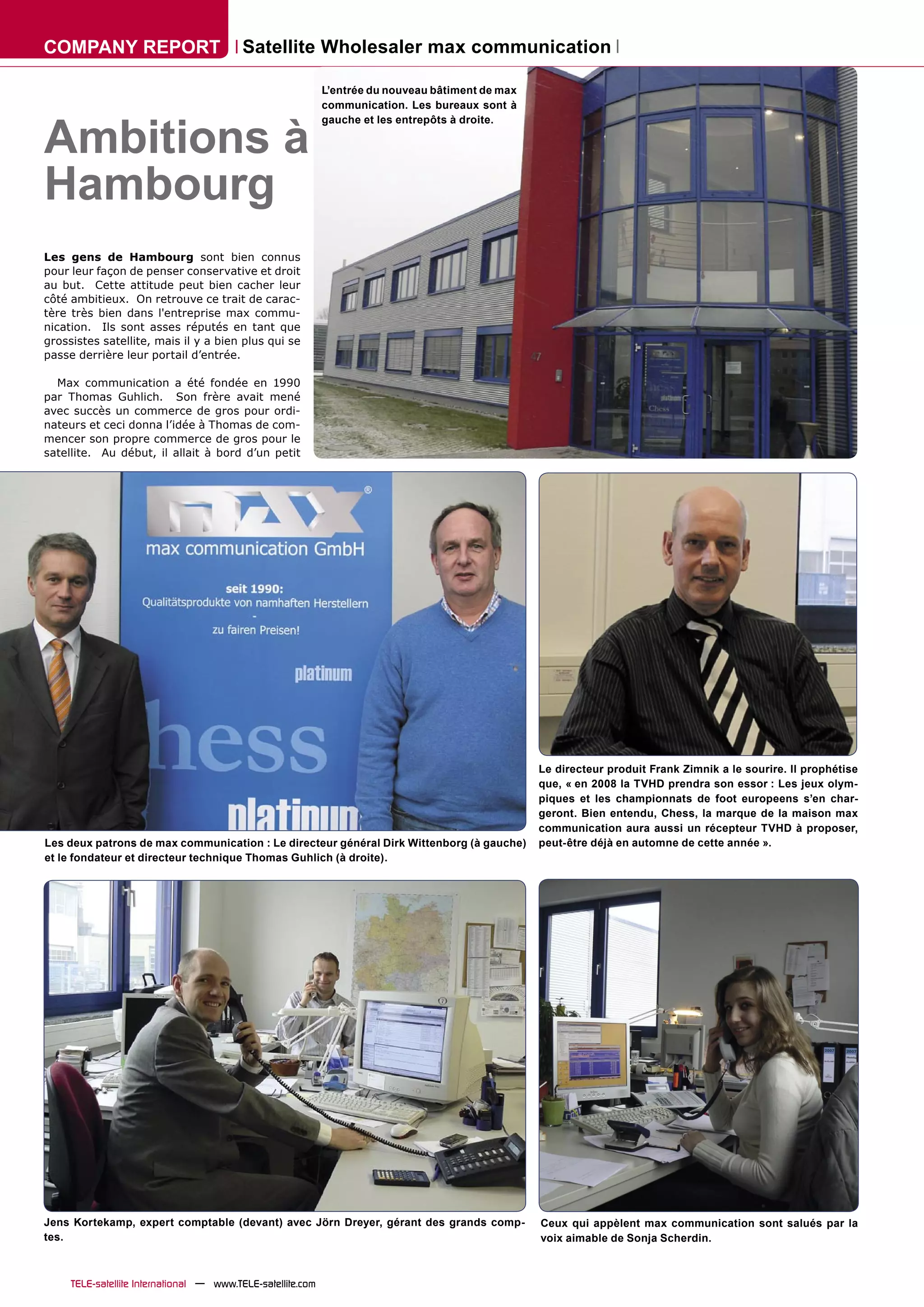 Max Communication, fondée en 1990 par Thomas Guhlich, est un grossiste en matériel satellite basé à Hambourg. L'entreprise a connu une croissance rapide, prévoyant une expansion à l'échelle européenne avec des services améliorés et un nouveau logiciel de gestion intégrée. Actuellement, 70% de ses ventes sont nationales, mais elle vise à diversifier ses exportations tout en offrant une large gamme de produits aux revendeurs.