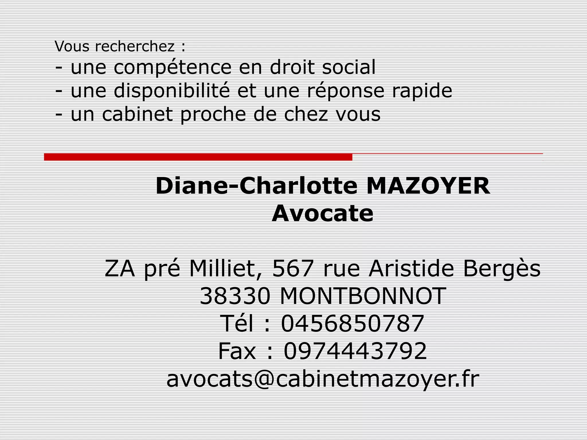 Diane-Charlotte Mazoyer est avocate spécialisée en droit social, offrant des services d'assistance, de conseil et de contentieux dans les domaines du travail et de la sécurité sociale. Elle est située à Montbonnot et propose une gamme complète de services, y compris la rédaction de contrats et des audits sociaux. Elle est également impliquée dans des missions auprès des entreprises et associations locales.