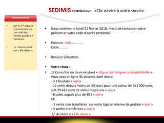 Le document décrit un système de gestion pour les représentants commerciaux permettant de consulter et d'intégrer des devis de matériel, en fournissant des outils de recherche et des liens vers des ressources documentaires. Les utilisateurs peuvent consulter des devis existants, accéder à des rubriques spécifiques et intégrer des options compatibles dans leurs devis. Le processus inclut une automatisation des frais et propose également des modules pour gérer la reprise de matériel et les commandes fournisseurs.