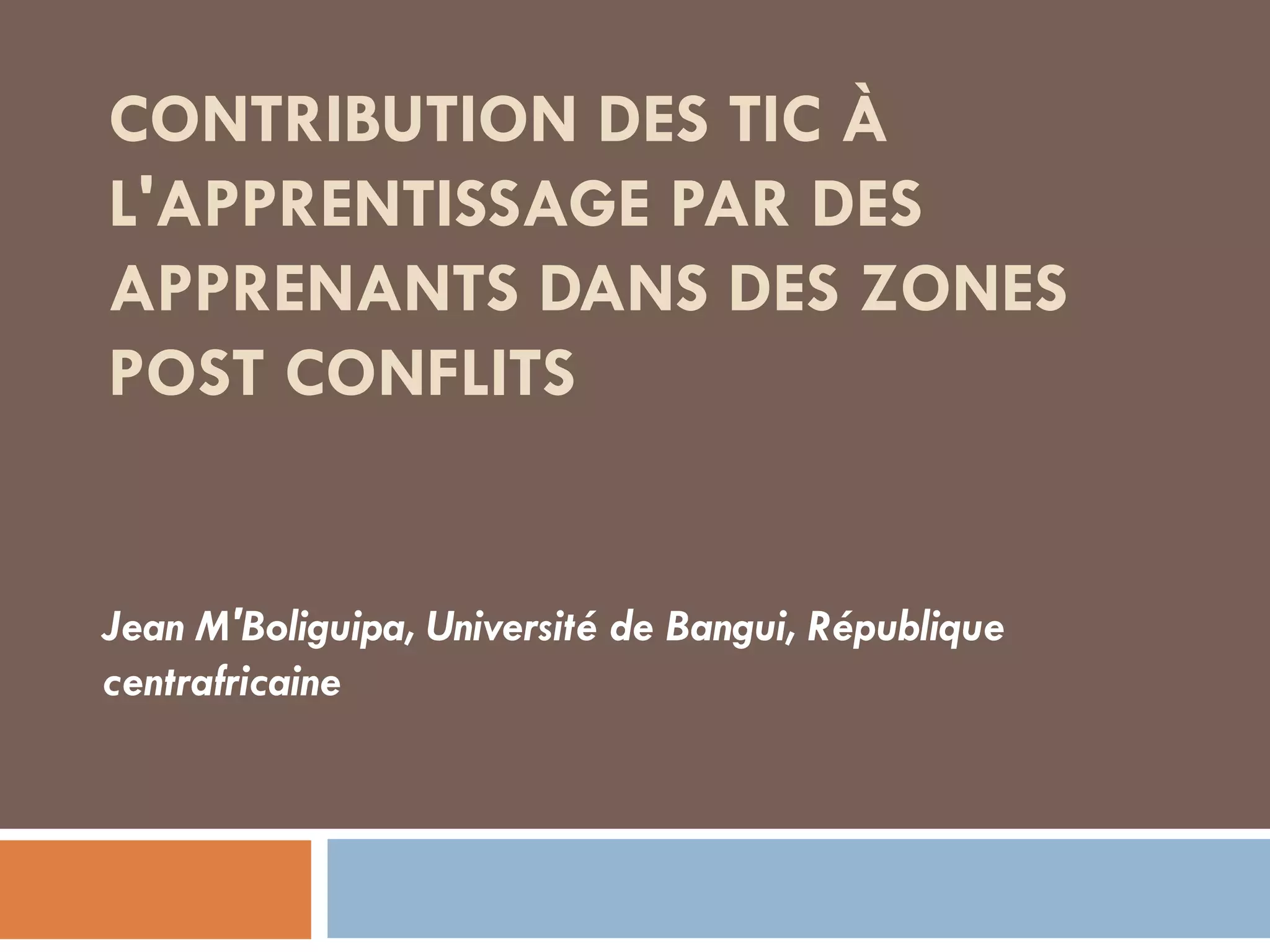Le document examine les défis auxquels font face les apprenants provenant de zones de conflit en République Centrafricaine, notamment la baisse des niveaux d'éducation et l'absence de formation aux TIC. Il propose l'utilisation des technologies de l'information et de la communication (TIC) comme solution pour surmonter ces défis, en introduisant des dispositifs tels que 'dar-tic' pour améliorer l'apprentissage en lecture et écriture. La recherche souligne la nécessité d'un soutien en formation et en infrastructures pour faciliter l'accès aux TIC pour ces apprenants.