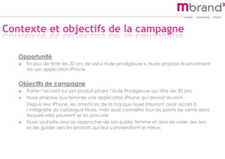 Nuxe a lancé une campagne pour célébrer les 20 ans de son huile prodigieuse en introduisant une application iPhone. L'application permet aux utilisatrices d'accéder à l'ensemble du catalogue Nuxe et de localiser les points de vente. La campagne a généré 350 000 impressions, avec un bon taux de clic et une appréciation pour la créativité graphique.