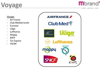 Le document présente diverses campagnes de marketing mobile pour plusieurs entreprises du secteur du voyage, telles qu'Air France, Club Méditerranée et Eurostar, visant à promouvoir des applications et services liés au voyage. Chaque campagne a des objectifs spécifiques, des dispositifs variés (bannières et interstitiels) et des taux de clic (CTR) mesurés pour évaluer l'efficacité. Les résultats montrent des taux de clics allant de 0,55% à 16,07%, indiquant des niveaux d'engagement différents selon les campagnes.
