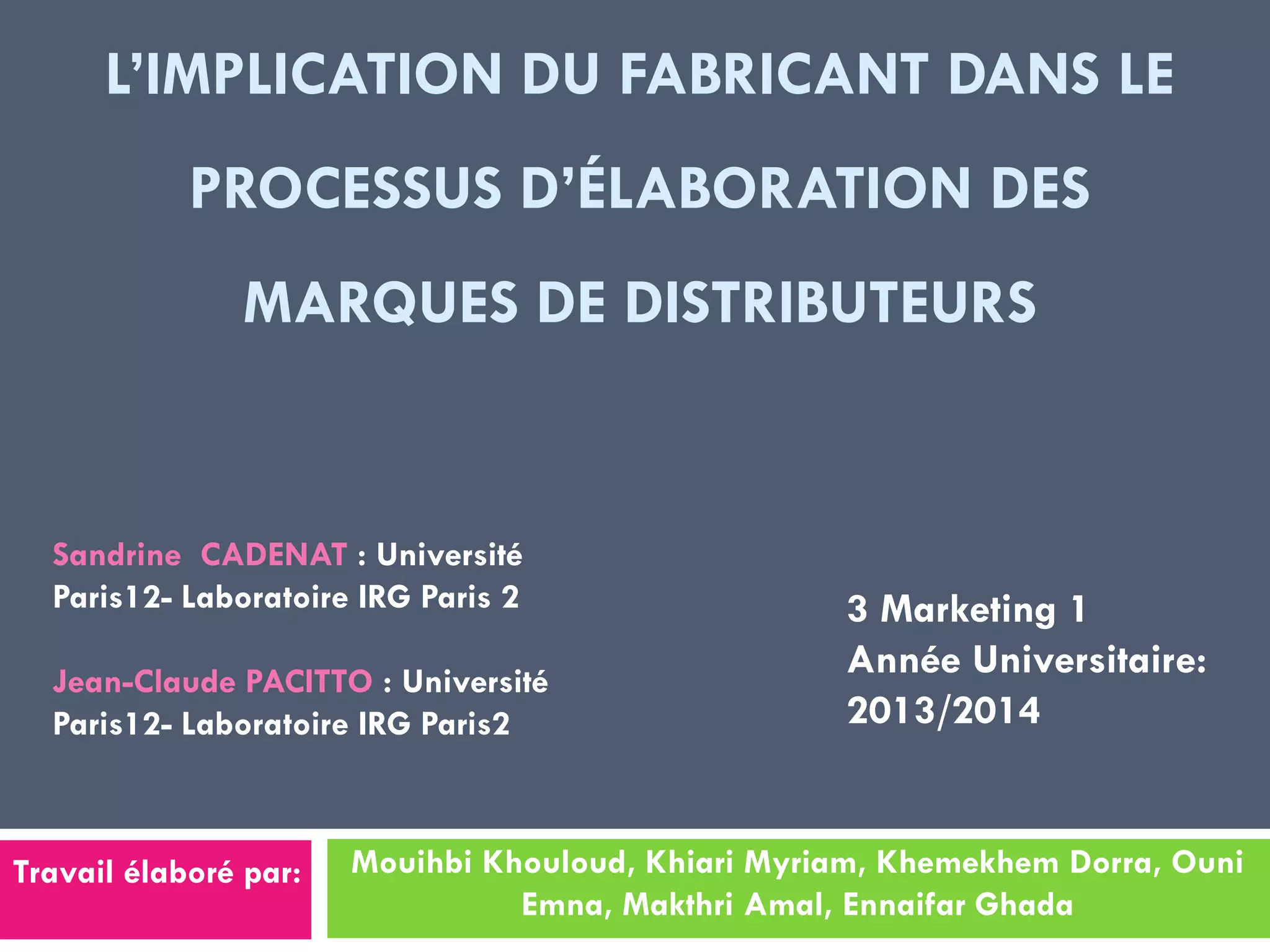 Ce document analyse le processus de développement des marques de distributeurs (MDD) en mettant l'accent sur l'implication des fabricants et les tendances du marché en Europe. Les résultats montrent que la majorité des entreprises adoptent la fabrication de MDD en réponse à la demande des distributeurs, et que les parts de marché des MDD varient considérablement selon les pays. La recherche met également en lumière les défis et les opportunités auxquels sont confrontés les fabricants dans l'élaboration de MDD.