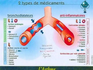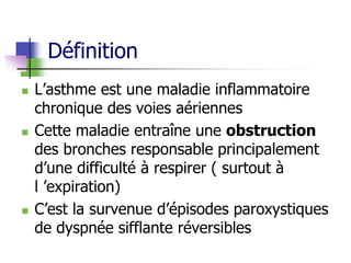 L'asthme est une maladie inflammatoire chronique des voies aériennes, provoquant une obstruction bronchique et des épisodes de dyspnée, sifflements et toux. Le traitement inclut des bronchodilatateurs et des anti-inflammatoires, visant à soulager les symptômes et à prévenir les crises. Une gestion efficace de l'asthme nécessite une classification des types et un suivi des déclencheurs environnementaux.