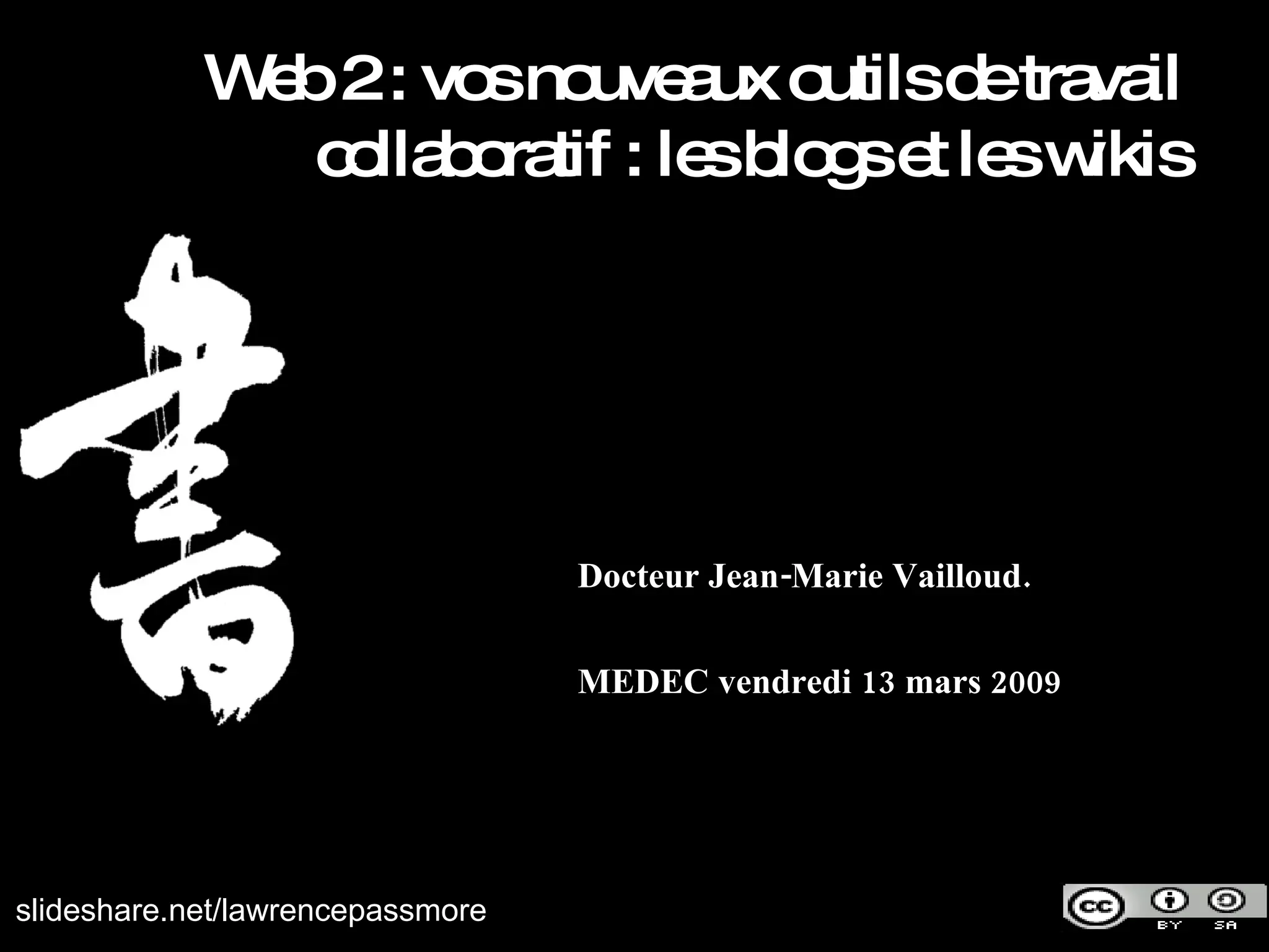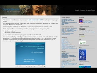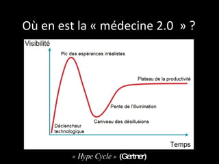 Le document aborde l'impact des outils collaboratifs tels que les blogs et les wikis dans le domaine de la médecine 2.0. Il présente des statistiques sur la création et l'activité des blogs, ainsi que des résultats d'enquête sur la maîtrise de ces outils par les professionnels de santé. La conclusion encourage à explorer et à utiliser ces nouvelles technologies dans le domaine médical.