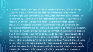La société média+ propose des services de marketing direct pour les PME, tel que le publipostage et l'e-mailing, afin de promouvoir des opérations commerciales. La bijouterie Rubis envisage d'utiliser ces techniques pour une opération anniversaire, avec un budget limité et sans site web. L'e-mailing est recommandé comme la technologie la plus adaptée pour cette bijouterie, car elle permet une communication efficace avec les clients à moindres coûts.