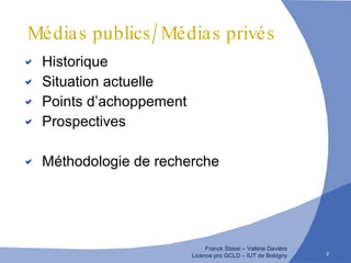 Le document examine l'évolution des médias publics et privés en France, soulignant l'importance historique de la liberté de la presse et les changements législatifs qui ont marqué ce secteur depuis l'Empire romain jusqu'à nos jours. Il aborde également les tensions entre les médias publics et privés, le développement de l'audiovisuel, ainsi que les enjeux de l'indépendance et de la diffusion dans le contexte numérique. Enfin, il présente une méthodologie de recherche détaillée sur le sujet, en se concentrant sur les aspects économiques et politiques des médias.