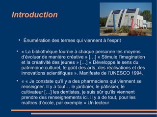 Le document présente une vision intégrée de la médiathèque moderne, soulignant son rôle dans le développement créatif des individus grâce à un accès diversifié aux ressources documentaires et numériques. Il aborde les aspects d'organisation humaine et matérielle, l'aménagement des espaces, et la gestion des activités de prêt et de formation. Enfin, la médiathèque est envisagée comme un espace de lien social, soutenue par des partenariats et des réseaux sociaux pour élargir son impact dans la communauté.